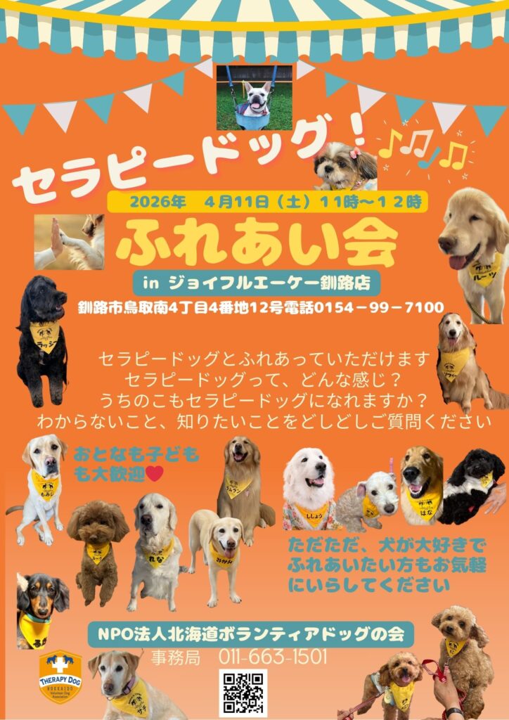 HOMEevent セラピードッグふれあい会 in ジョイフルエーケー釧路店 セラピードッグふれあい会 in ジョイフルエーケー釧路店 2026-02-18 2026年春 適性検査のお知らせ 2026-02-04 セラピードッグふれあい会 in ジョイフルエーケー帯広店 2026-01-30
