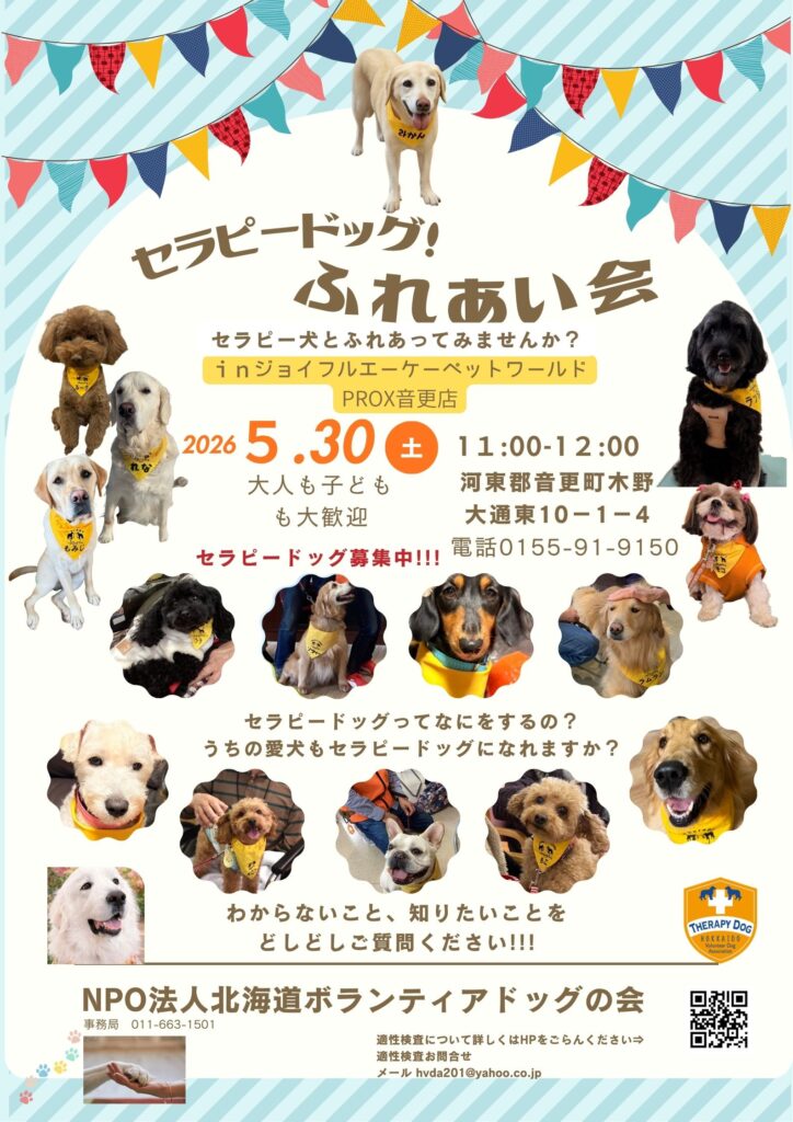 HOMEevent セラピードッグふれあい会 in ジョイフルエーケー音更店 セラピードッグふれあい会 in ジョイフルエーケー音更店 2026-04-27 セラピードッグふれあい会 in ジョイフルエーケー釧路店 2026-02-18 2026年春 適性検査のお知らせ 2026-02-04